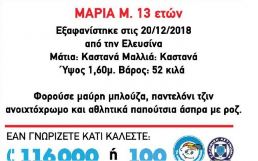Πρόκειται για την Μαρία Μ που έχει ύψος 1,60 μ., ζυγίζει 52 κιλά, έχει καστανά μαλλιά και καστανά μάτια. Την ημέρα που εξαφανίστηκε φορούσε τζιν ανοιχτόχρωμο παντελόνι, μαύρη μπλούζα και αθλητικά παπούτσια άσπρα με ροζ.
