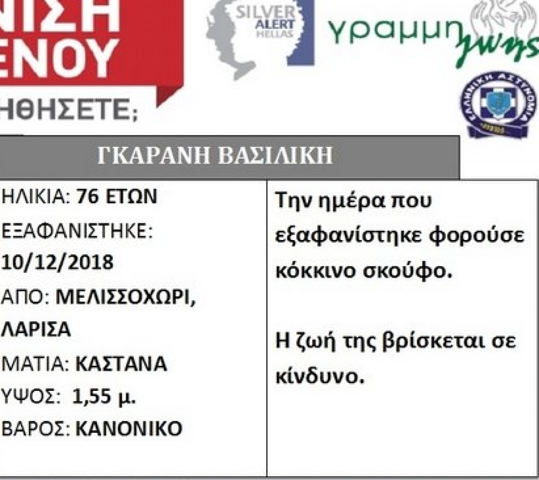 Η γυναίκα ονομάζεται Βασιλική Γκαράνη , τα ίχνη της οποίας χάθηκαν στις 10 Δεκεμβρίου από το Μελισσοχώρι της Λάρισας.