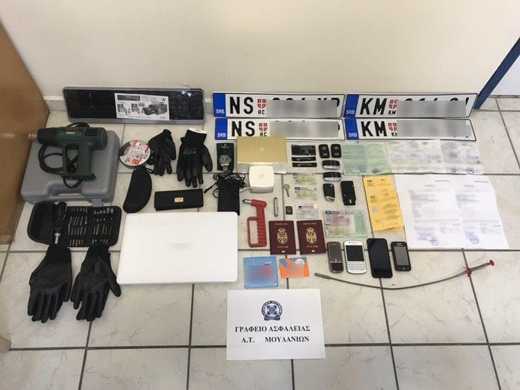 Από τη κατοχή των συλληφθέντων κατασχέθηκε ένα αυτοκίνητο που χρησιμοποιούσαν για να εντοπίζουν και να αφαιρούν τα οχήματα, ενώ σε έρευνες που πραγματοποιήθηκαν από τους αστυνομικούς στο παραπάνω όχημά τους και στην οικία των συλληφθέντων, βρέθηκαν μεταξύ άλλων και κατασχέθηκαν η συσκευή διάγνωσης εγκεφάλου των οχημάτων, 4 κλειδιά αυτοκινήτων, εκ των οποίων 2 της μάρκας που στόχευαν, 4 διαρρηκτικά εργαλεία, 4 ζευγάρια γάντια, δύο καλύμματα προστασίας, με τα οποία σκέπαζαν τα κλεμμένα οχήματα, δύο ζεύγη πινακίδων κυκλοφορίας με στοιχεία Σερβίας, ένας φορητός ηλεκτρονικός υπολογιστής, 3 κινητά τηλέφωνα, έγγραφα σχετικά με αυτοκίνητα (άδειες κυκλοφορίας, ασφαλιστήριο συμβόλαιο κ.α.).