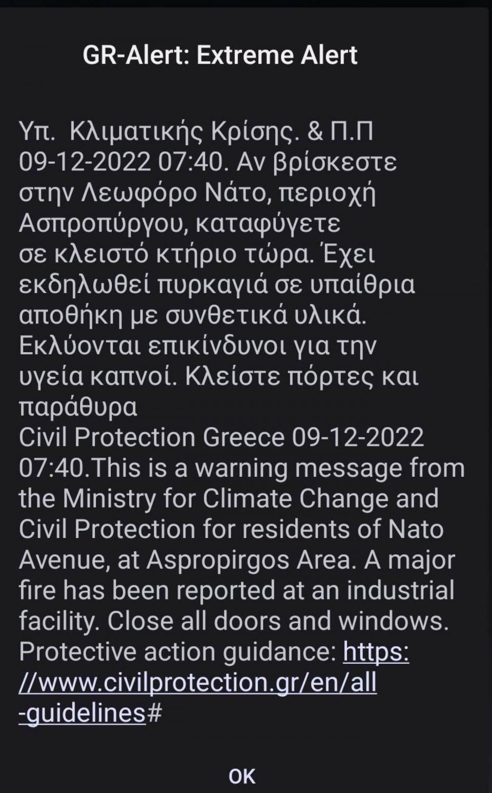 Όπως έγινε γνωστό, εστάλη στους κατοίκους της περιοχής μήνυμα από το 112 με το οποίο καλούνται να παραμείνουν στα σπίτια τους με κλειστά παράθυρα.