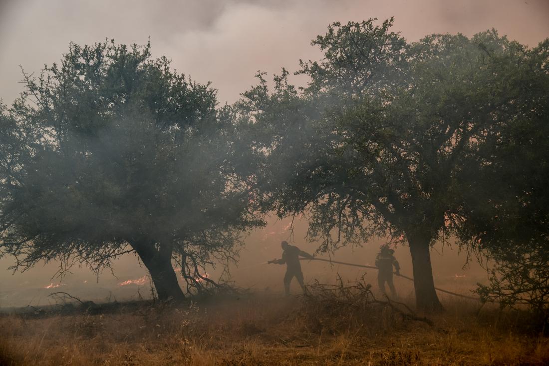 Με το πρώτο φως της μέρας πέταξαν και τα εναέρια μέσα και επιχειρούν 5 ελικόπτερα και 5 αεροσκάφη, μεταξύ των οποίων και το Beriev-200. Από επίγειες δυνάμεις επιχειρούν 427 πυροσβέστες, εννέα (9) ομάδες πεζοπόρων τμημάτων, 149 οχήματα, συμπεριλαμβανομένου του ΜΕΤΠΕ καθώς και των 143 πυροσβεστών από την Πολωνία με 46 οχήματα. Για τη συνδρομή στον συντονισμό των δυνάμεων έχει διατεθεί το Κινητό Επιχειρησιακό Κέντρο ΟΛΥΜΠΟΣ. Συνδρομή παρέχουν ο Ελληνικός Στρατός με 5 ομάδες πεζοπόρων τμημάτων και μηχανήματα έργου, εθελοντές πυροσβέστες, καθώς και υδροφόρες και χωματουργικά μηχανήματα της Περιφέρειας και της Τοπικής Αυτοδιοίκησης. Τις πυροσβεστικές δυνάμεις συντονίζει ο αρχηγός του Πυροσβεστικού Σώματος Αντιστράτηγος Στέφανος Κολοκούρης.