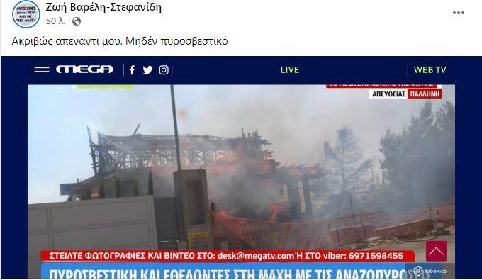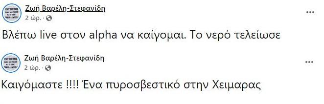 «Καιγόμαστε! Ένα πυροσβεστικό στην Χειμάρας » ήταν η πρώτη ανάρτηση που έκανε η μητέρα της αθλήτριάς μας, για να συμπληρώσει λίγα λεπτά ότι: «Βλέπω live στον alpha να καίγομαι. Το νερό τελείωσε Ακριβώς απέναντι μου. Μηδέν πυροσβεστικό ».