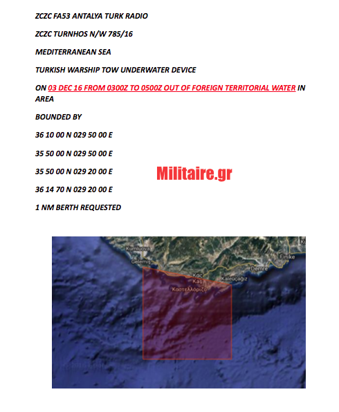 Η τουρκική ΝAVTEX 784/16 αφορά δέσμευση περιοχής για άσκηση το χρονικό διάστημα 08-10 Δεκεμβρίου 2016.