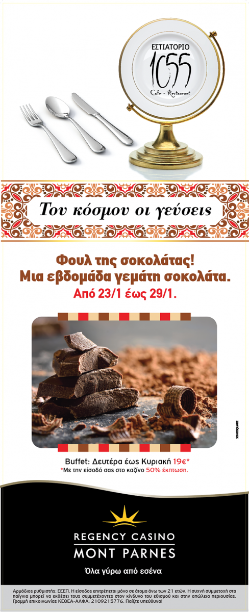 Μια εβδομάδα γεμάτη σοκολάτα θα λάβει χώρα στο εστιατόριο 1055 του Regency Casino Mont Parnes. Η μοναδική θέα σε όλη την Αθήνα συνδυάζεται με τις μαγευτικές γεύσεις της σοκολάτας σε μια εβδομάδα γλυκιάς γευσιγνωσίας από τις 23/1 έως και τις 29/1.