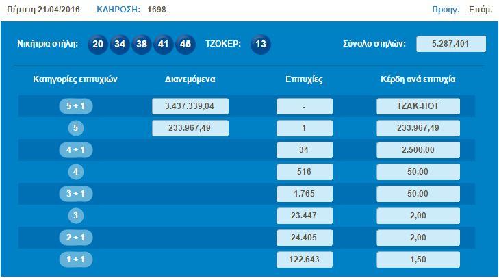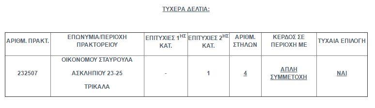 Το τελευταίο μεγάλο ποσό που δόθηκε ήταν αυτό την περασμένης Πέμπτης στη δεύτερη κατηγορία (5άρια) όπου είχε βρεθεί ένα τυχερό δελτίο, που κέρδισε το ποσό των € 233.967,49 .