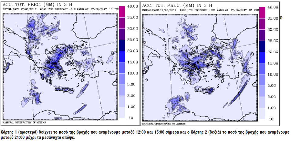 Νεφώσεις παροδικά αυξημένες με βροχές και τοπικές καταιγίδες στα ανατολικά ηπειρωτικά από το ύψος της Θεσσαλίας και νοτιότερα, στα νησιά του Αιγαίου, κυρίως του Κεντρικού και Νότιου Αιγαίου και πιθανότητα τοπικών όμβρων στα δυτικά κυρίως ορεινά ηπειρωτικά τις θερμές ώρες της ημέρας περιμένουμε την Πέμπτη 18 Μαΐου 2017.