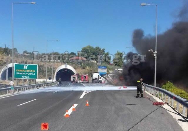 Νταλίκα που μετέφερε παπούτσια τυλίχθηκε στις φλόγες στο ύψος του Αγίου Κωνσταντίνου. Η νταλίκα με Τούρκο οδηγό ήταν φορτωμένη με υποδήματα και κινούταν στο ρεύμα από Αθήνα προς Λαμία.
