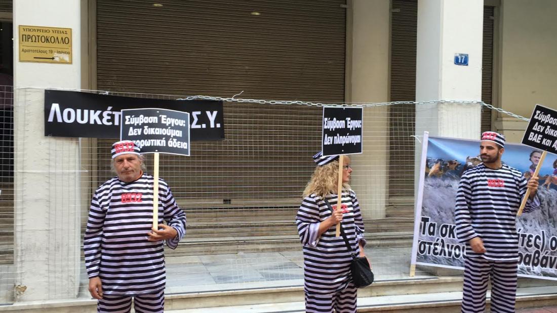 Έναν πρωτότυπο τρόπο βρήκαν οι εργαζόμενοι στα νοσοκομεία για να διαμαρτυρηθούν. Φορώντας τις χαρακτηριστικές ριγέ ασπρόμαυρες στολές των καταδίκων προκειμένου με τον τρόπο αυτό να δείξουν την καταδικασμένη κατάσταση στην οποία βρίσκονται λόγω των συμβάσεων έργου με τις οποίες έχουν προσληφθει, συγκεντρώθηκαν από νωρίς έξω απο το υπουργείο Υγείας εργαζόμενοι στα δημόσια νοσοκομεία στο πλαίσιο της κινητοποίησης της Πανελλήνιας Ομοσπονδίας Εργαζομένων Δημοσίων Νοσοκομείων (ΠΟΕΔΗΝ).