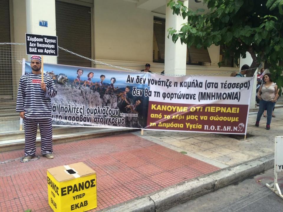 Οι εργαζόμενοι στα νοσοκομεία έστησαν και κουτιά στα οποία έγραψαν «έρανος» προκειμένου με αυτόν τον τρόπο να δείξουν την οικονομική ασφυξία στο χώρο της υγείας.