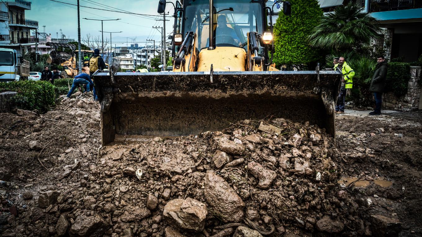 Καθαρισμός της πόλης: Εκατοντάδες φορτηγά απομακρύνουν τεράστιους όγκους φερτών υλικών, όπως πέτρες, χώμα, ακόμη και είδη υγιεινής που παρασύρθηκαν από τον Υμηττό.