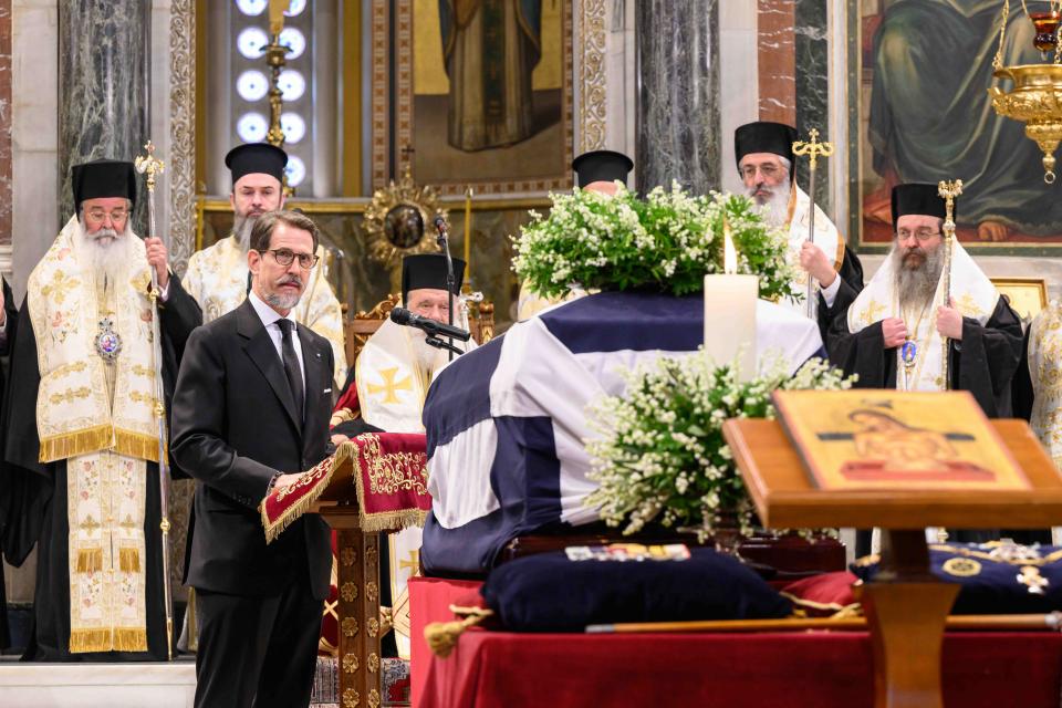 Η σορός μεταφέθηκε στο ναό της Μητρόπολης λίγα λεπτά αφότου έφτασαν εκεί οι γιοι του τέως βασιλιά Κωνσταντίνου. Οι Νικόλαος και Φίλιππος πήραν τις θέσεις τους εντός του ναού, ενώ ο μεγαλύτερος αδελφός τους Παύλος υποδεχόταν τους υψηλούς προσκεκλημένους, βασιλείς, διαδόχους και μέλη έντεκα βασιλικών οίκων από την Ευρώπη. Ανάμεσά τους, ο επίτιμος βασιλιάς της Ισπανίας Χουάν Κάρλος που συνόδευσε την βασιλομήτωρα Σοφία, ο βασιλιάς Φελίπε και η βασίλισσα Λετίθια της Ισπανίας, τα βασιλιά ζεύγη της Ολλανδίας, της Δανίας, της Σουηδίας, του Βελγίου, ο πρίγκιπας Αλβέρτος του Μονακό, ο πρίγκιπας- διάδοχος Χάακον της Νορβηγίας με τη σύζυγό του πριγκίπισσα Μέτε Μάριτ. Η πριγκίπισσα Αννα της Μ. Βρετανίας εκπροσώπησε τη βρετανική βασιλική οικογένεια.