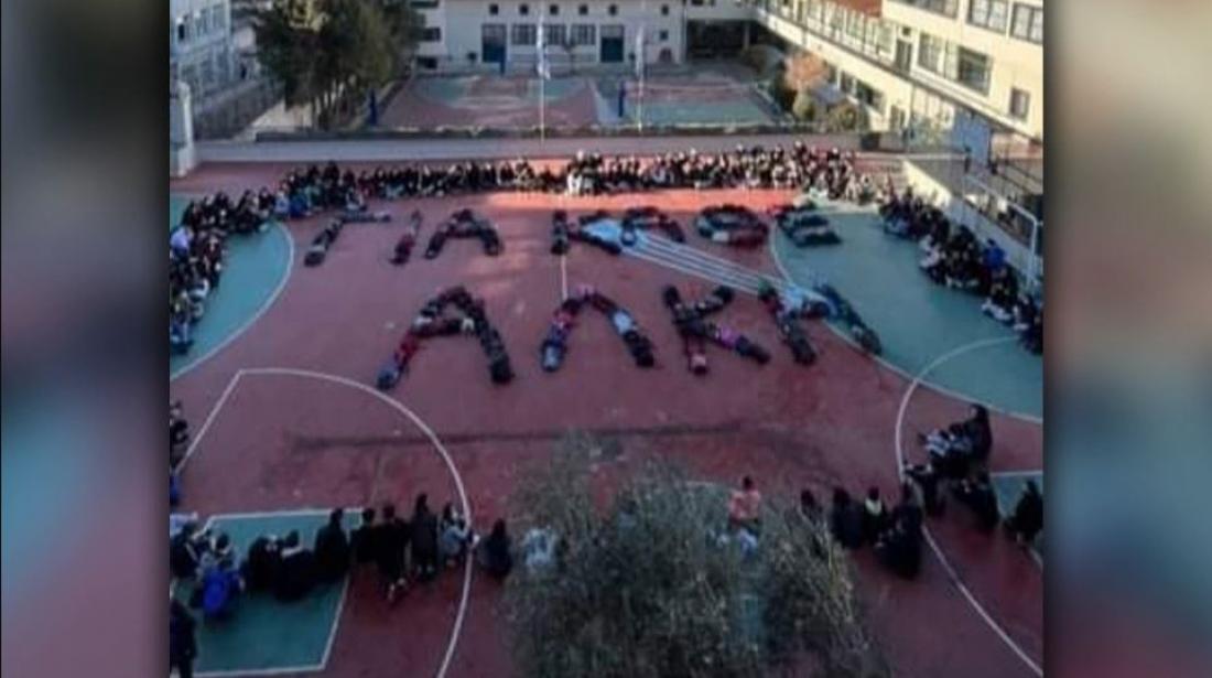 Οι μαθητές έβγαλαν τις τσάντες από τους ώμους τους και με αυτές... έγραψαν το σύνθημα «Για Κάθε Άλκη», ενώ οι ίδιοι σχημάτισαν γύρω του μια ανθρώπινη αλυσίδα.