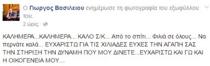 Με ένα μήνυμα του στον προσωπικό του λογαριασμό στο Facebook ο Γιώργος Βασιλείου ο οποίος ταλαιπωρείται από καρκίνο του πνεύμονα και πρόσφατα τελείωσε τον κύκλο των ακτινοβολιών, πήρε εξιτήριο από το νοσοκομείο, ευχαρίστησε τους ανθρώπους που τους στέκονται και του δίνουν δύναμη με τα μηνύματα τους.