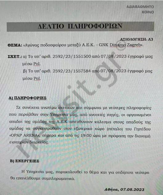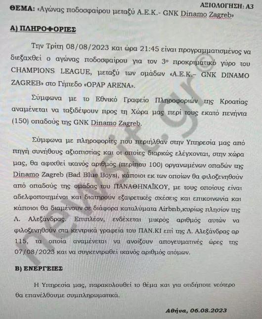 «Την Τρίτη 8/8/ 2023 και ώρα 21:45, είναι προγραμματισμένος να διεξαχθεί ο αγώνας ποδοσφαίρου για τον 3ο προκριματικό γύρο του Champions League μεταξύ ομάδων ΑΕΚ – GΝΚ Dinamo Zagreb στο γήπεδο OPAP ARENA. Σύμφωνα με το Εθνικό Γραφείο Πληροφοριών της Κροατίας, αναμένεται να ταξιδέψουν προς την χώρα μας περί τους 150 οπαδούς της  GΝΚ Dinamo Zagreb. Σύμφωνα με πληροφορίες που περιήλθαν στην υπηρεσία μας από πηγή συνήθους αξιοπιστίας και οι οποίες διαρκώς ελέγχονται, στην χώρα μας θα αφιχθή ικανός αριθμός περίπου – 100 οργανωμένων οπαδών της GΝΚ Dinamo Zagreb – BAD BLUE BOYS- κάποιοι εκ των οποίων θα φιλοξενηθούν από οπαδούς της ομάδας του Παναθηναϊκού με τους οποίους είναι αδελφοποιημένοι και διατηρούν εξαιρετικές σχέσεις και επικοινωνία και κάποιοι θα διαμένουν σε διάφορα καταλύματα Airbnb κυρίως πλησίον της λεωφόρου Αλεξάνδρας. Επιπλέον ενδέχεται μικρός αριθμός αυτών να φιλοξενηθούν στα κεντρικά γραφεία του ΠΑΝ.ΚΙ  επί της Λ. Αλεξάνδρας αριθμός 115 τα οποία αναμένεται να ανοίξουν απογευματινές ώρες 7/8/2023 και να συγκεντρωθεί ικανός αριθμός ατόμων. Ενέργειες: υπηρεσία μας παρακολουθεί το θέμα και για οποιοδήποτε νεότερο θα επανέλθουμε συμπληρωματικά».