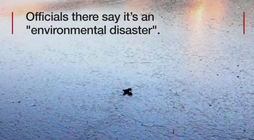 Η εικόνα ενός πουλιού που παλεύει να βγει από τα μολυσμένα νερά συγκλονίζει.