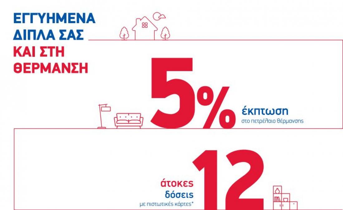Για ακόμη μία χρονιά, η ΕΚΟ κατανοώντας τις ανάγκες της εποχής, παραμένει έμπρακτα δίπλα στους Έλληνες καταναλωτές, δίνοντάς τους τη δυνατότητα να προμηθευτούν πετρέλαιο θέρμανσης με έκπτωση 5% και εξόφληση σε 12 άτοκες δόσεις με πιστωτικές κάρτες ελληνικών τραπεζών.