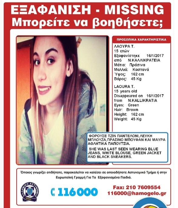 Όπως αναφέρει το «Χαμόγελο του Παιδιού» η 15χρονη γεννήθηκε το 2002, έχει καταγωγή από την Αλβανία, ονομάζεται Λάουρα, έχει ύψος 1,62 μ., ζυγίζει 45 κιλά, έχει καστανά μαλλιά και πράσινα μάτια. Την ημέρα που εξαφανίστηκε φορούσε ανοιχτόχρωμο μπλε τζιν παντελόνι, λευκή μακριμάνικη μπλούζα, πράσινο μπουφάν και μαύρα αθλητικά παπούτσια.