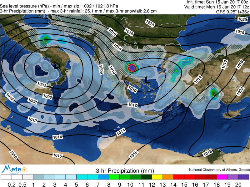 Τη Δευτέρα 16 Ιανουαρίου 2017 στη Δυτική Ελλάδα, στο Ανατολικό και Νότιο Αιγαίο, στην Εύβοια, στις Σποράδες, στην Ανατολική Στερεά και στην Ανατολική Θεσσαλία θα εκδηλώνονται κατά τόπους ισχυρές βροχοπτώσεις. Σποραδικές καταιγίδες θα εκδηλωθούν κυρίως στα δυτικά ηπειρωτικά, στο Ιόνιο και στο Αιγαίο. Πυκνές χιονοπτώσεις αναμένονται σε όλα τα ηπειρωτικά ορεινά, σε ημιορεινά τμήματα της Θεσσαλίας και της Ηπείρου, καθώς και σε περιοχές της Μακεδονίας με ακόμη χαμηλότερο υψόμετρο. Στη Νοτιοανατολική Στερεά, στην Πελοπόννησο και στις Κυκλάδες τις μεσημεριανές και απογευματινές ώρες ο καιρός θα είναι βελτιωμένος, με νέα επιδείνωση το βράδυ. Αντίθετα πρόσκαιρη βελτίωση του καιρού αναμένεται το βράδυ στην Ανατολική Μακεδονία και στη Θράκη. Παγετός θα εκδηλωθεί τις πρωινές και βραδινές ώρες στα κεντρικά και βόρεια ηπειρωτικά.