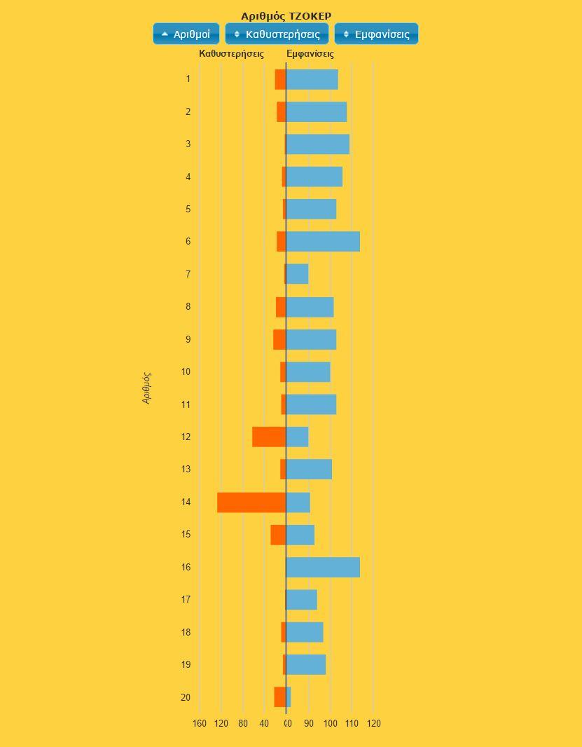 Αντίθετα οι αριθμοί που έχουν «καθυστερήσει» πιο πολύ να εμφανιστούν είναι 44, 19, 23, 6, 24 και Τζόκερ το 14.