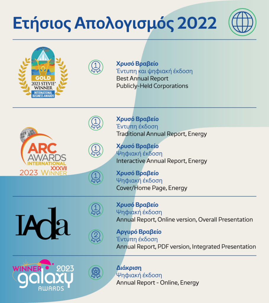 Τόσο ο έντυπος όσο και ο ψηφιακός Ετήσιος Απολογισμός 2022 – Empowering Tomorrow, απέσπασαν τα εξής βραβεία (6)και διακρίσεις (1):