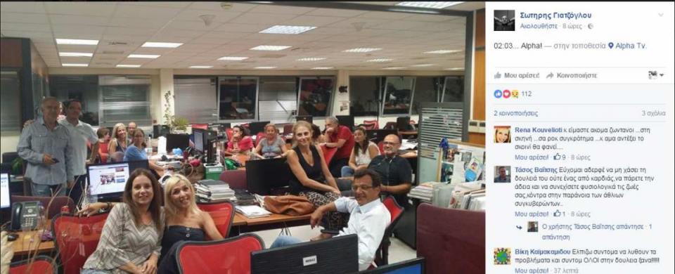 Φωτογραφία στον προσωπικό του λογαριασμό στο Facebook από την αίθουσα σύνταξης του «Alpha» ανέβασε στις 2:03, ελάχιστα λεπτά πριν ανακοινωθούν οι άδειες και ο δημοσιογράφος Σωτηρης Γιατζόγλου.
