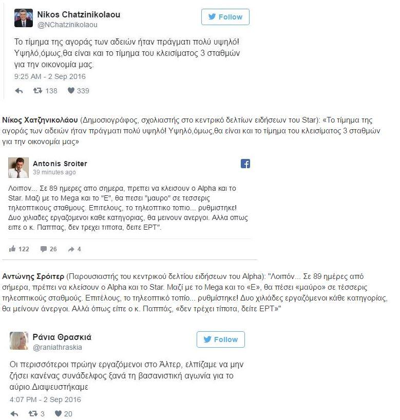 Μέσα από τους προσωπικούς τους λογαριασμούς στο facebook, twitter και Instagram, δημοσιογράφοι αλλά και άνθρωποι του καλλιτεχνικού χώρου σχολιάζουν με το δικό τους τρόπο, τη δημοπράτηση των τηλεοπτικών αδειών, εστιάζοντας στο κλείσιμο καναλιών.
