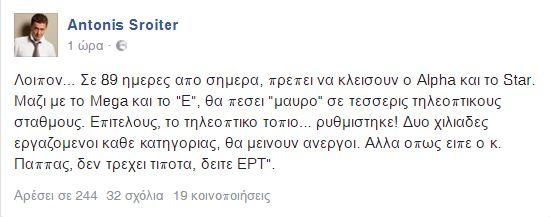 Μέσω του προσωπικού λογαριασμού του στο Facebook ο παρουσιαστής του κεντρικού δελτίου ειδήσεων του Alpha, Αντώνης Σρόιτερ, ξέσπασε με μήνυμα του για την δημοπρασία των τηλεοπτικών αδειών. «Λοιπόν... Σε 89 ημέρες από σήμερα, πρέπει να κλείσουν ο Αlpha και το Star. Μαζί με το Μega και το «Ε», θα πέσει «μαύρο» σε τέσσερις τηλεοπτικούς σταθμούς. Επιτέλους, το τηλεοπτικό τοπίο... ρυθμίστηκε! Δυο χιλιάδες εργαζόμενοι κάθε κατηγορίας, θα μείνουν άνεργοι. Αλλά όπως είπε ο κ. Παππάς, δεν τρέχει τίποτα, δείτε ΕΡΤ»» έγραψε ο Αντώνης Σρόιτερ.
