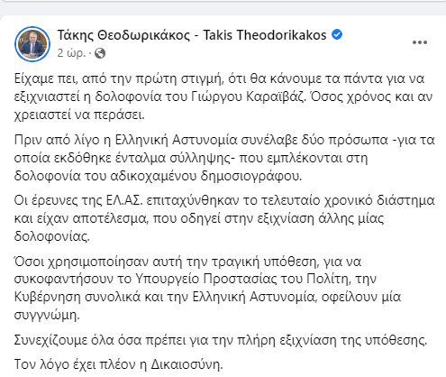 Υπενθυμίζεται ότι ο υπουργός Προστασίας του Πολίτη, Τάκης Θεοδωρικάκος, γνωστοποίησε με ανάρτησή του στο Facebook ότι η ΕΛ.ΑΣ. προχώρησε σε δύο συλλήψεις για την υπόθεση της δολοφονίας του δημοσιογράφου Γιώργου Καραϊβάζ.