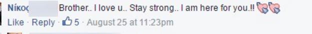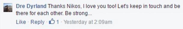 «Σε αγαπώ θα είμαι εδώ για σένα». Ο 40 χρονος Ντρε του απάντησε :«Σ΄ευχαριστώ Νίκο, κι εγώ σ αγαπώ. Να κρατήσουμε επαφή και να στηρίζουμε ο ένας τον άλλο. Να είσαι δυνατός».