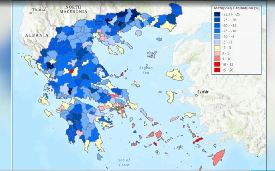 Αναλυτικότερα, με εξαίρεση τα Δωδεκάνησα και τις Κυκλάδες, όλη η ηπειρωτική χώρα στο σύνολο σχεδόν είναι μπλε, γεγονός που σημαίνει ότι η ύπαιθρος φθίνει περισσότερο από τα υπόλοιπα σημεία της χώρας. Εξαίρεση έχουμε στα δύο αστικά κέντρα Αθήνα – Θεσσαλονίκη, που και πάλι στα κέντρα καταγράφεται μια ελαφριά μείωση, αλλά έχουμε αύξηση στα προάστια, στις γύρω περιοχές.