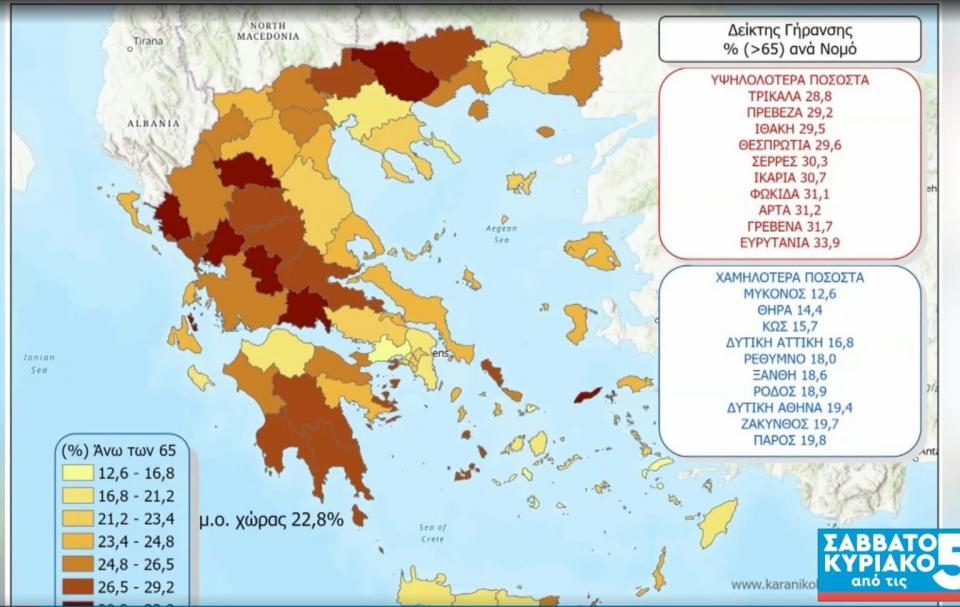 Τα υψηλότερα ποσοστά καταγράφονται στην περιοχή των Τρικάλων με 28,8%. Δηλαδή σχεδόν ένας στους τρεις είναι πάνω από τα 65 και ακολουθεί η Πρέβεζα, Ιθάκη Θεσπρωτίας, Σέρρες, Ικαρία κτλ, ενώ τα χαμηλότερα ποσοστά είναι στα νησιά Μύκονος, Θήρα, Σαντορίνη, Κως, στην Δυτική Αττική, στην Δυτική Αθήνα και στην Πάρο.