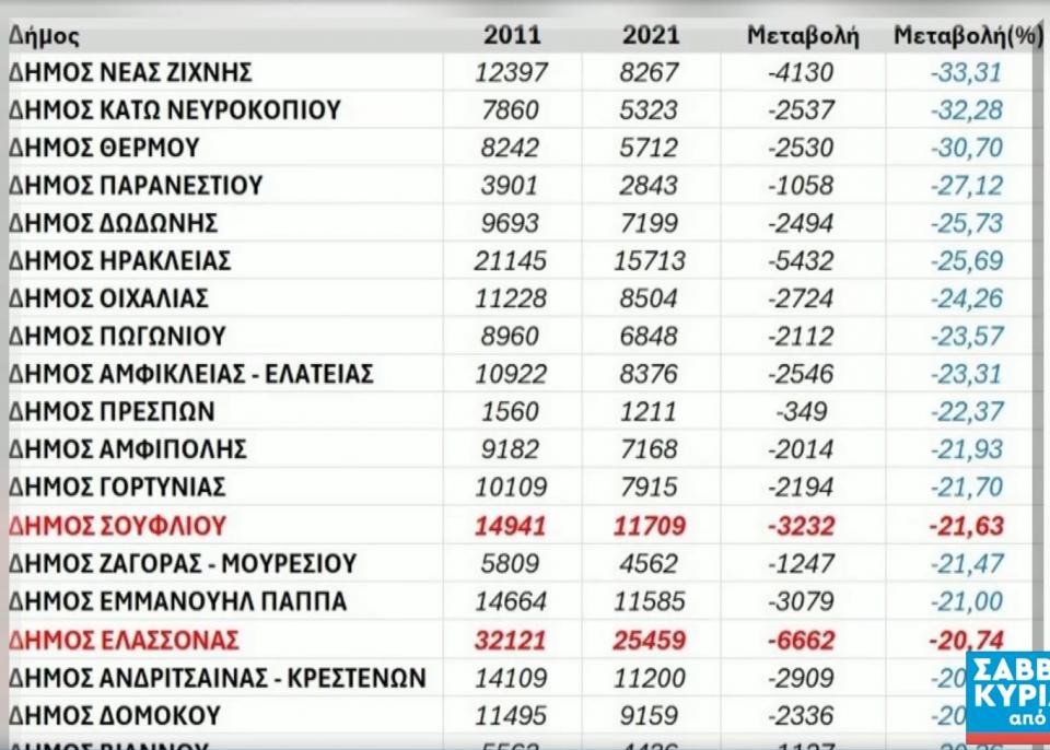 Επιπλέον, σημειώνεται πως η εικόνα αποδεικνύει ότι το σύνολο της ελληνικής επαρχίας ερημώνει με τεράστιους ρυθμούς, οι οποίοι φθάνουν ακόμη και την τελευταία 10ετία πάνω από 20% -30%.