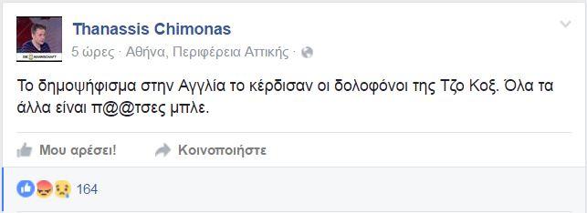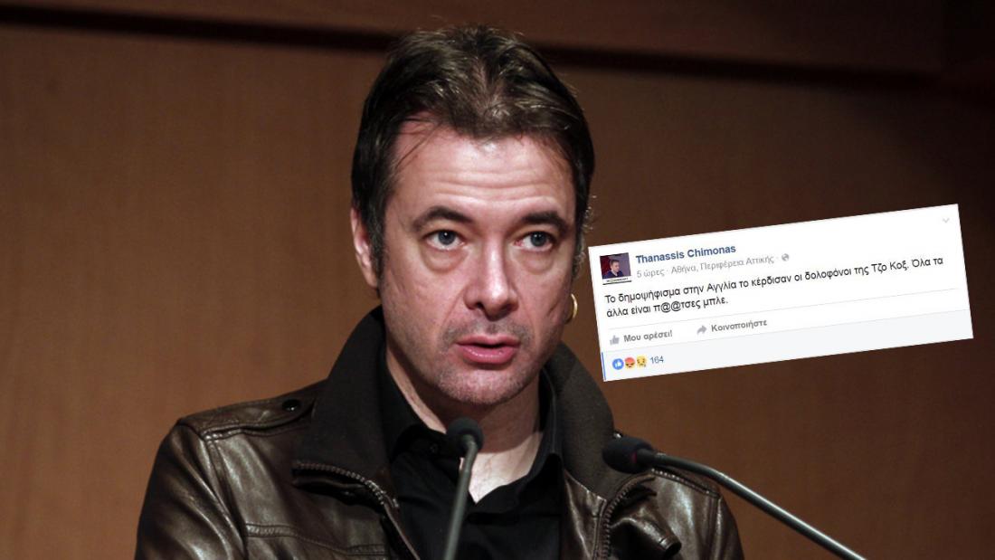 Η ανάλυση του πολιτιστικού εκπροσώπου του ΠΑΣΟΚ, Θανάση Χειμωνά, για το Brexit: «Το δημοψήφισμα στην Αγγλία το κέρδισαν οι δολοφόνοι της Τζο Κοξ. Όλα τα άλλα είναι π@@τσες μπλε».