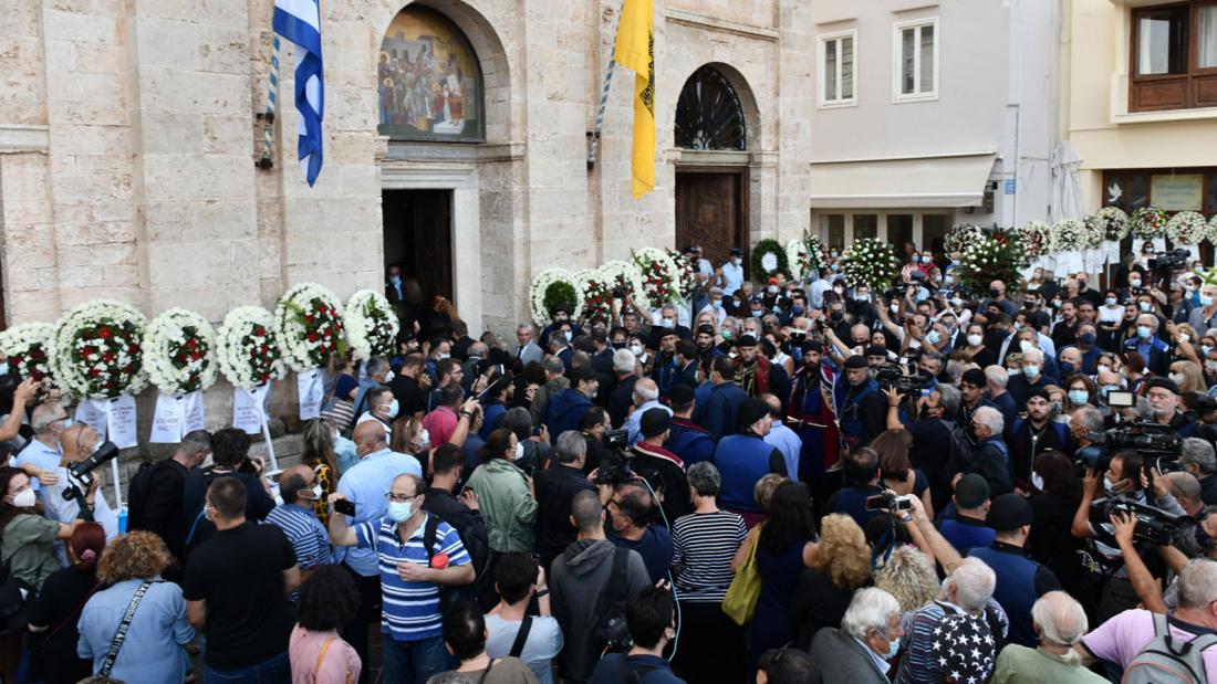 Την στιγμή που η σορός έφτασε στον ναό, υπό τους ήχους της φιλαρμονικής του δήμου, οι συγκεντρωμένοι πολίτες ξέσπασαν σε χειροκροτήματα και φώναζαν «αθάνατος». Στον χώρο μπροστά από τον ναό είχαν παραταχθεί -φορώντας παραδοσιακές στολές της Κρήτης- μέλη πολιτιστικών και παραδοσιακών συλλόγων, ενώ κατά την πορεία προς τον ναό φοιτητές τραγουδούσαν τραγούδια του Μίκη Θεοδωράκη. Η είσοδος στον ναό, παρά τον πολύ κόσμο, γίνεται με τάξη και με τήρηση των μέτρων κατά της πανδημίας.