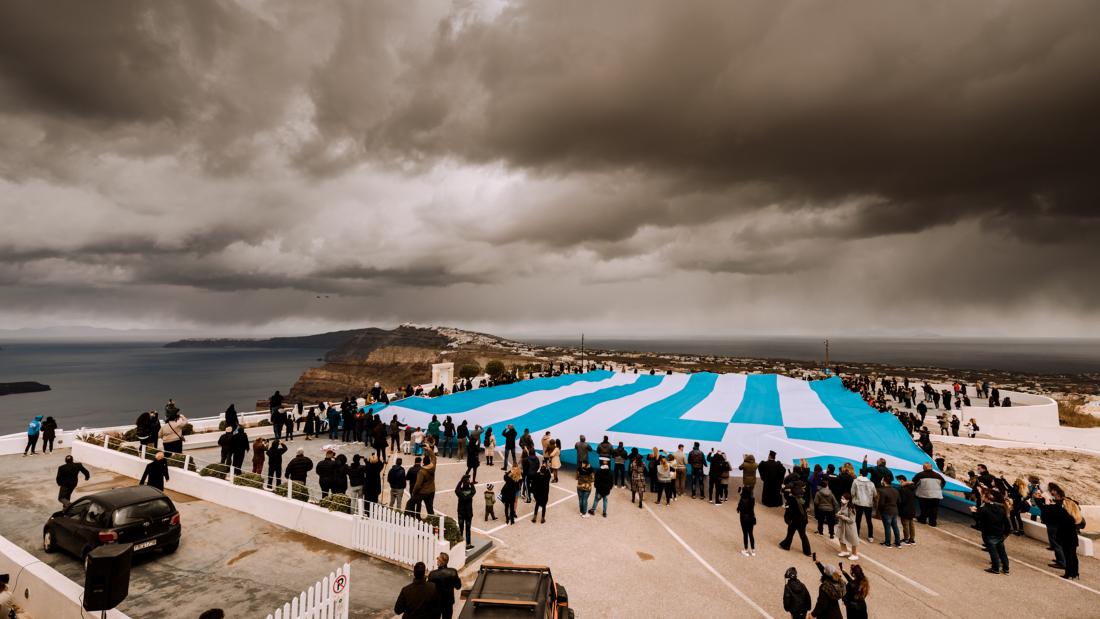 Στην περιοχή του Πύργου στη Σαντορίνη έγινε η τελετή ανάρτησης της μεγαλύτερης ελληνικής σημαίας ανήμερα της εθνικής μας επετείου, με αφορμή τη συμπλήρωση 200 ετών από την επανάσταση του 1821.