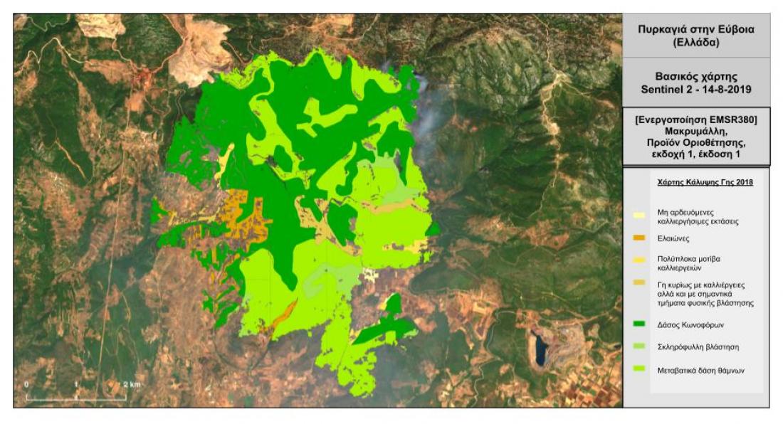 Ο χάρτης που το Copernicus δίνει σήμερα στη δημοσιότητα μέσω του ΑΠΕ-ΜΠΕ δείχνει αναλυτικά την κατανομή των χρήσεων γης (όπως αυτές είχαν καταγραφεί το 2018) των εκτάσεων που κάηκαν μέχρι και την Τετάρτη 14 Αυγούστου. Δεδομένου ότι η πυρκαγιά έκτοτε κινήθηκε κυρίως με αναζωπυρώσεις στις περιοχές από όπου είχε ήδη περάσει η φωτιά, εκτιμάται ότι η γεωγραφική έκταση που αποτυπώνεται εδώ δεν απέχει πολύ από την συνολική, μέχρι σήμερα, καμένη έκταση.