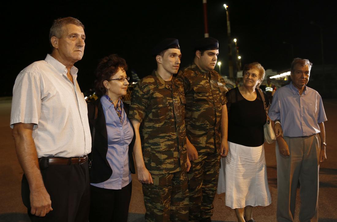 Στρατιωτικό άγημα απέδωσε τιμές και οι δύο στρατιωτικοί αποβιβάστηκαν φορώντας στρατιωτικές στολές και κατευθύνθηκαν πρώτα στον υπουργό Εθνικής Άμυνας πριν χαθούν στην αγκαλιά των γονιών τους.