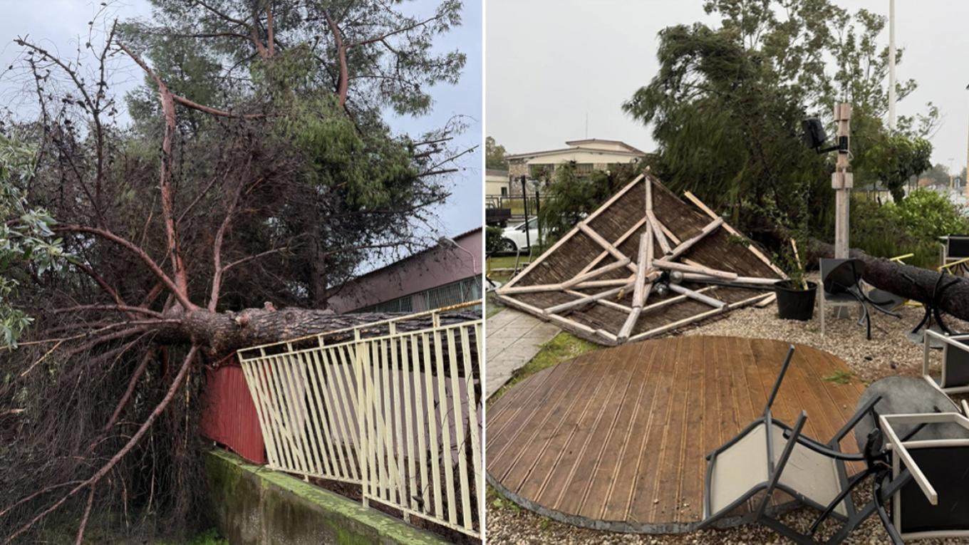 Το φαινόμενο εκδηλώθηκε από την περιοχή του λιμανιού έως τη Ζέστη, με τον δυνατό άνεμο να ξεριζώνει δέντρα, να αφαιρεί στέγες και να παρασύρει μεγάλες μεταλλικές κατασκευές. Χαρακτηριστικό περιστατικό αποτέλεσε η πτώση μιας μεγάλης μεταλλικής πέργκολας, η οποία χτύπησε έναν ευκάλυπτο προτού καταλήξει στη μέση του δρόμου, όπως μετέδωσε το agrinionews.gr.