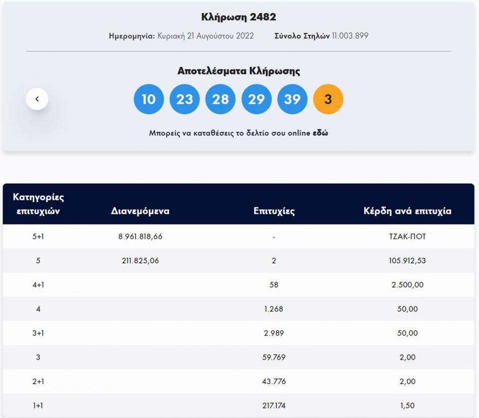 Και νέο τζακ ποτ στο τζόκερ-Κυριακή 21/08/2022-Κλήρωσης 2482: Τουλάχιστον 9.961.818 ευρώ θα μοιράσει στην επόμενη κλήρωση