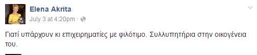 Και οι κόντρες συνεχίζονται. Η ανάρτηση στο facebook της δημοσιογράφου Έλενας Ακρίτα για την αυτοκτονία του Μαμιδάκη: "Γιατί υπάρχουν κι επιχειρηματίες με φιλότιμο", αποτέλεσε αυτή τη φορά, "τροφή" για σχόλια για την δημοσιογράφο 'Έλλη Στάη.