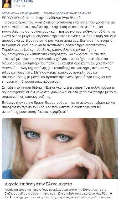 Η Έλενα Ακρίτα πριν λίγες ώρες ανέβασε στον προσωπικό της λογαριασμό στο Facebook ένα κείμενο που μιλά για την σκληρή επίθεση που έχει δεχτεί από την Έλλη Στάη με τον τίτλο "Ακραία επίθεση στην Έλενα Ακρίτα". Συγκεκριμένα, το κείμενο της Εφημερίδας των Συντακτών από την Άντα Ψαρρά υποστηρίζει την Έλενα και απαντά: