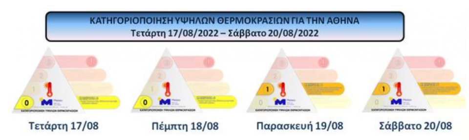 Επισημαίνεται ότι υψηλό θα είναι το θερμικό φορτίο στην πόλη της Αθήνας. Όπως φαίνεται στο παρακάτω σχήμα, οι θερμοκρασιακές συνθήκες θα εντάσσονται στην κατηγορία 0 την Τετάρτη 17/08 και την Πέμπτη 18/08, ενώ αναβάθμιση στην κατηγορία 1 αναμένεται για την Παρασκευή 19/08 και το Σάββατο 20/08. Η κατηγοριοποίηση αυτή των υψηλών θερμοκρασιών εφαρμόζεται πιλοτικά από τη μονάδα ΜΕTEO/EAA, σε συνεργασία με την επιστημονική επιτροπή του Arsht-Rock Resilience Center του ιδρύματος Atlantic Council