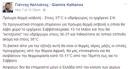 Συγκεκριμένα ο Γιάννης Καλλιάνος προειδοποίησε πως το ερχόμενο Σαββατοκύριακο (13-14/05/20147) ο υδράργυρος θα «εκτοξευτεί» στους 36 με 37 βαθμούς και πιθανότατα σε τοπικό επίπεδο ακόμη και στους 38 βαθμούς. «Το βασικό αίτιο για την εξέλιξη αυτή θα είναι οι θερμές αέριες μάζες οι οποίες προερχόμενες από την Βόρεια Αφρική, θα μας επισκεφτούν και θα ανεβάσουν την θερμοκρασία κατά 10-11°C από την Πέμπτη έως και το Σάββατο» έγραψε, μεταξύ άλλων, ο Γιάννης Καλλιάνος.