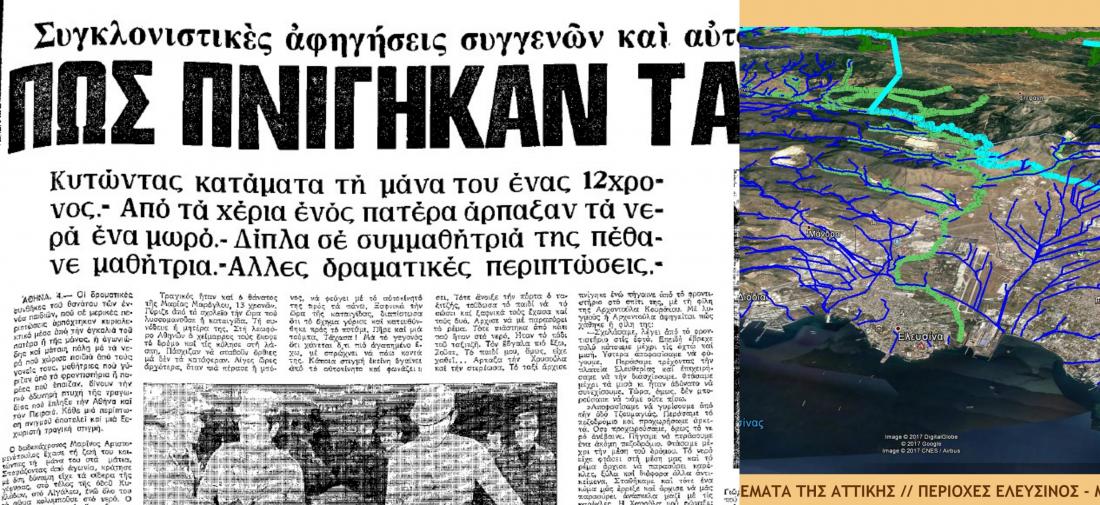 Τα νερά τώρα που πέφτουν στα βορειοδυτικά βουνά της περιοχής μέσα από ένα δίκτυο ρεμάτων (Λυκόρρεμα, Εκκλόρεμα, Μικρό Κατερίνι, Αγίας Αικατερίνης, Λούτσας), αν δεν είχαν μπαζωθεί θα εξέβαλαν τα νερά τους στην δυτική πλευρά του Ελευσινιακού κόλπου, όπως βλέπετε στον παρακάτω χάρτη.Με αυτή την λογική, μπορεί ο καθένας να καταλάβει γιατί όλα πήγαν στραβά στην νεροποντή και τώρα θρηνούμε νεκρούς.