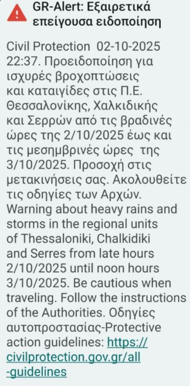 “Προσοχή στις μετακινήσεις σας. Ακολουθείται τις οδηγίες των Αρχών”, τονίζεται στο μήνυμα από την Πολιτική Προστασία.