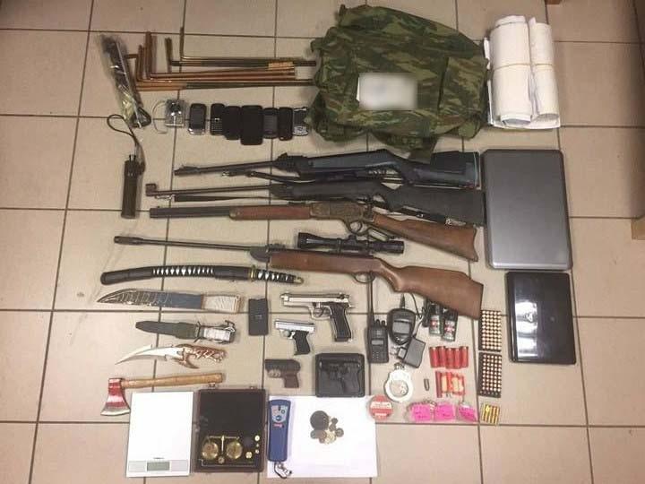 Ο λόγος είναι ότι έπειτα από έρευνα που ακολούθησε στην οικία του συλληφθέντα βρέθηκαν και κατασχέθηκαν μεταξύ άλλων αεροβόλα όπλα και πιστόλια κρότου, αλεξίσφαιρο, χειροπέδες, taser, φυσίγγια, συσκευή ανίχνευσης μετάλλων, αρχαία νομίσματα κλπ.