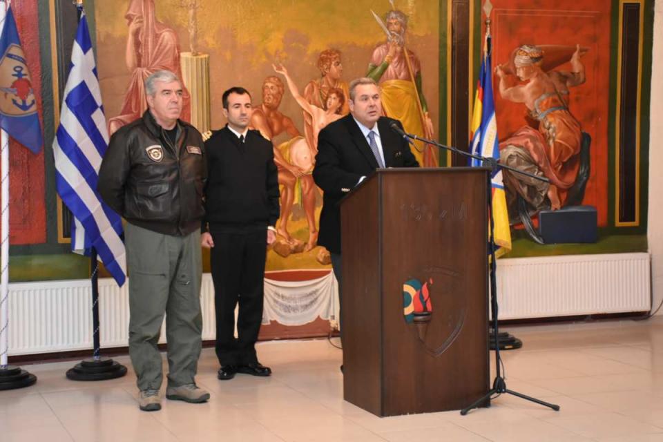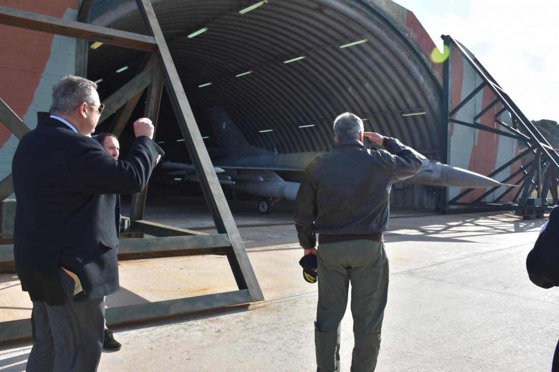 Στο χαιρετισμό του προς το προσωπικό της 135 σμηναρχίας Μάχης, ο κ. Καμμένος εξήρε τη συμβολή του νησιού στην υπεράσπιση του εθνικού εναέριου χώρου και στην προάσπιση της εθνικής κυριαρχίας και της εδαφικής ακεραιότητας της χώρας.