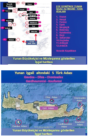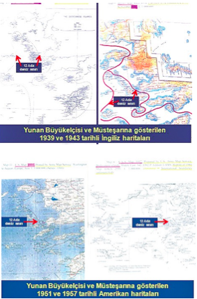 Σύμφωνα πάντα με την ανάρτηση κατά τη διάρκεια της συνάντησης τέθηκε στον Έλληνα διπλωμάτη το θέμα της υποτιθέμενης «παράνομης κατοχής» και του επιδείχθηκαν και οι ακόλουθοι χάρτες όπου φαίνονται τα 12 νησιά-βραχονησίδες στο Αιγαίο καθώς και τα 5 στο Κρητικό Πέλαγος τα οποία διεκδικεί η Τουρκία.