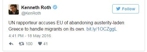 Τέλος, ο διευθυντής του Παρατηρητηρίου Ανθρωπίνων Δικαιωμάτων (Human Rights Watch, HRW) Κένεθ Ροθ, σχολίασε από την πλευρά του στο Twitter: «Ο εισηγητής του ΟΗΕ κατηγόρησε την ΕΕ ότι εγκατέλειψε τη μαστιζόμενη από λιτότητα Ελλάδα να χειριστεί το μεταναστευτικό μόνη της»