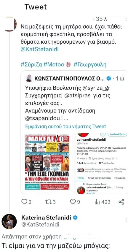 Χρήστης του Twitter τάγκαρε την Κατερίνα Στεφανίδη στις αναρτήσεις της μητέρας της. «Να μαζέψεις τη μητέρα σου, έχει πάθει κομματική φανατίλα, προσβάλει τα θύματα κατηγορουμένων για βιασμό» έγραψε ένας χρήστης απευθυνόμενος στην Ελληνίδα πρωταθλήτρια.